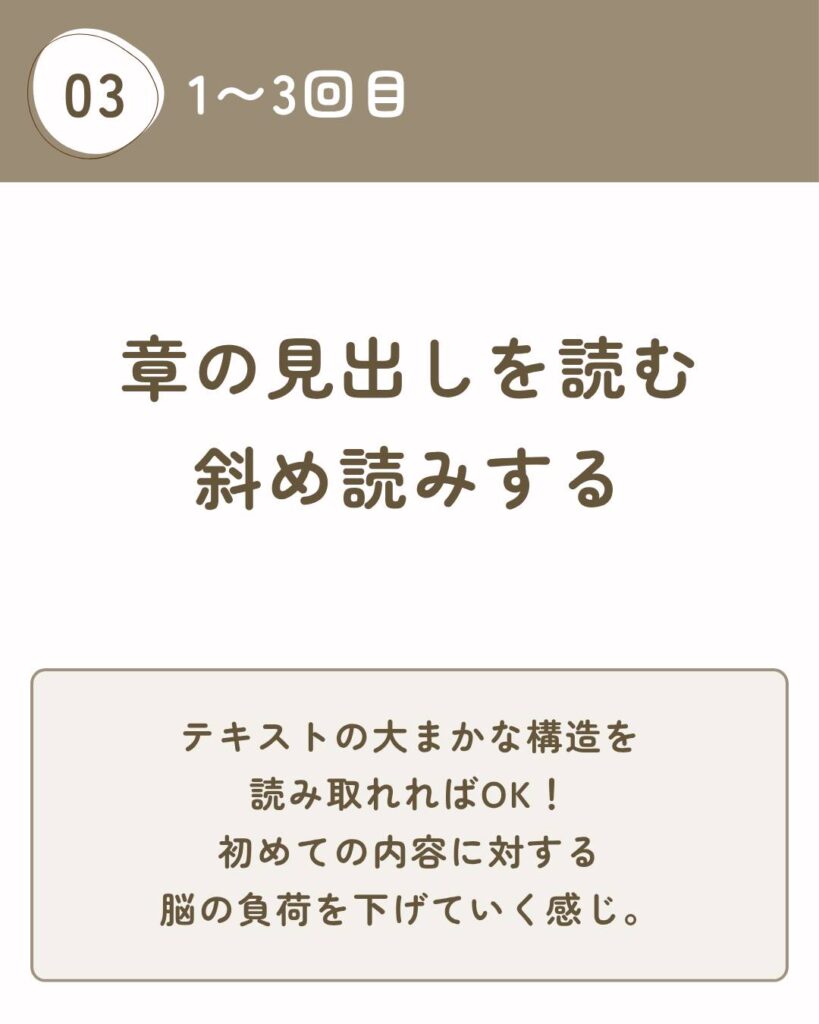 章の見出しだけ読む斜め読みする内容の大まかな構造だけつかめれば完璧「初めて読む負荷」を下げるイメージとにかく“軽く触れる”。
